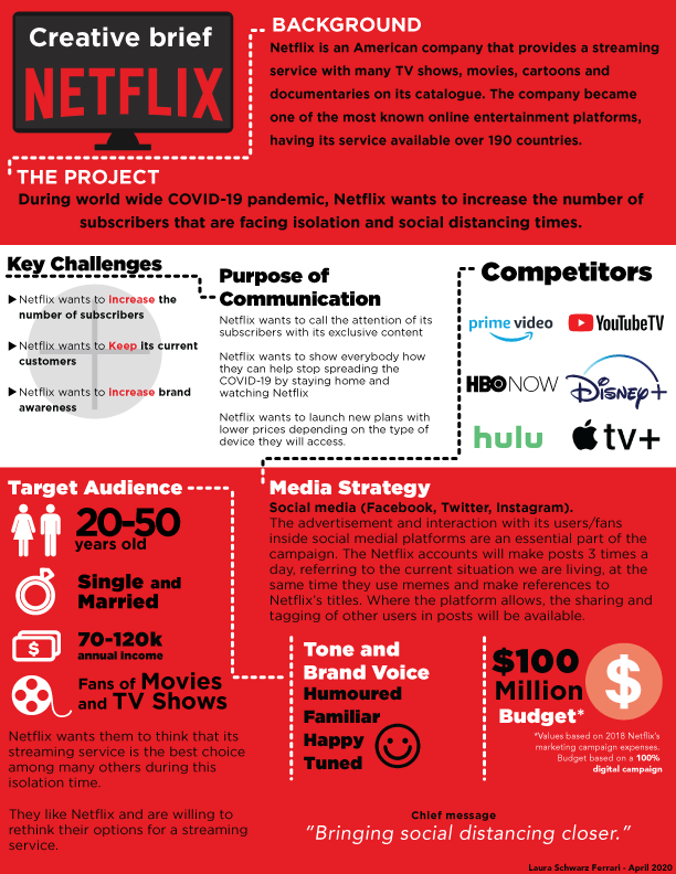 Lastly, the Netflix creative brief explains the Media Strategy and Budget for this project. The media strategy summarizes how Netflix will deliver this project. For example, this advertisement will run through social media. This brief is specific on how many times Netflix social media will post and what they will say.